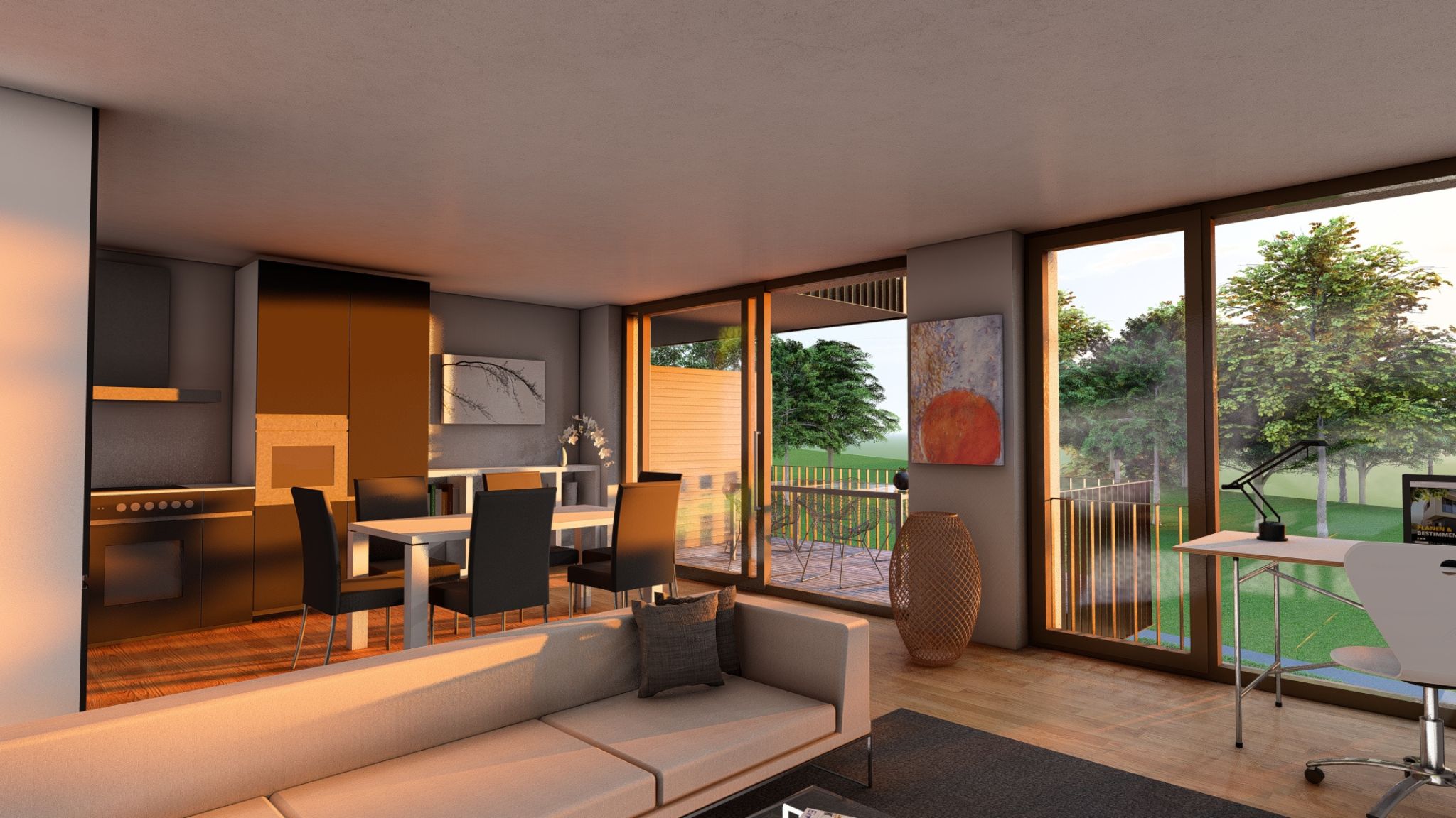 Übrigens: Das Gebäude wird als Effizienzhaus 40 errichtet – ein ökologisch verantwortungsvoller Energiestandard, der die Anforderungen der KfW-Förderung erfüllt. Eine Sole/Wasser-Wärmepumpe nutzt Erdwärme, die Photovoltaikanlage auf dem Dach erzeugt Strom für das Hausnetz. Die massive Ziegelbauweise mit Wärmedämmverbundsystem sorgt für ein angenehmes Raumklima bei besonders niedrigem Heizwärmebedarf.