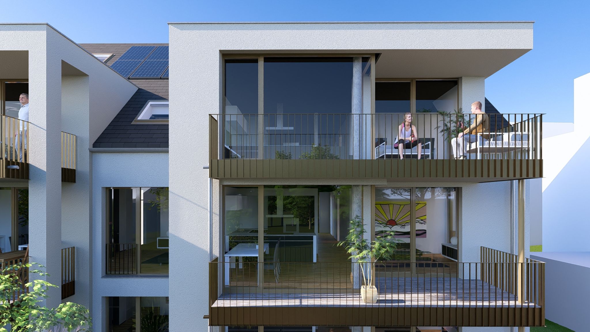Besonders charakteristisch sind die schönen, schützenden Laubengänge, die zu den individuellen Hauseingängen führen. Ein Aufzug verbindet die Tiefgarage schwellenlos mit allen Etagen, die Erdgeschosswohnungen sind vollkommen barrierefrei. Offene Wohn-, Ess- und Kochbereiche schaffen Weite und verbinden praktische Funktionalität mit wohnlicher Atmosphäre. Großzügige Terrassen mit Gartenzugang, Balkone und Dachterrassen erweitern den Wohnraum ins Freie.