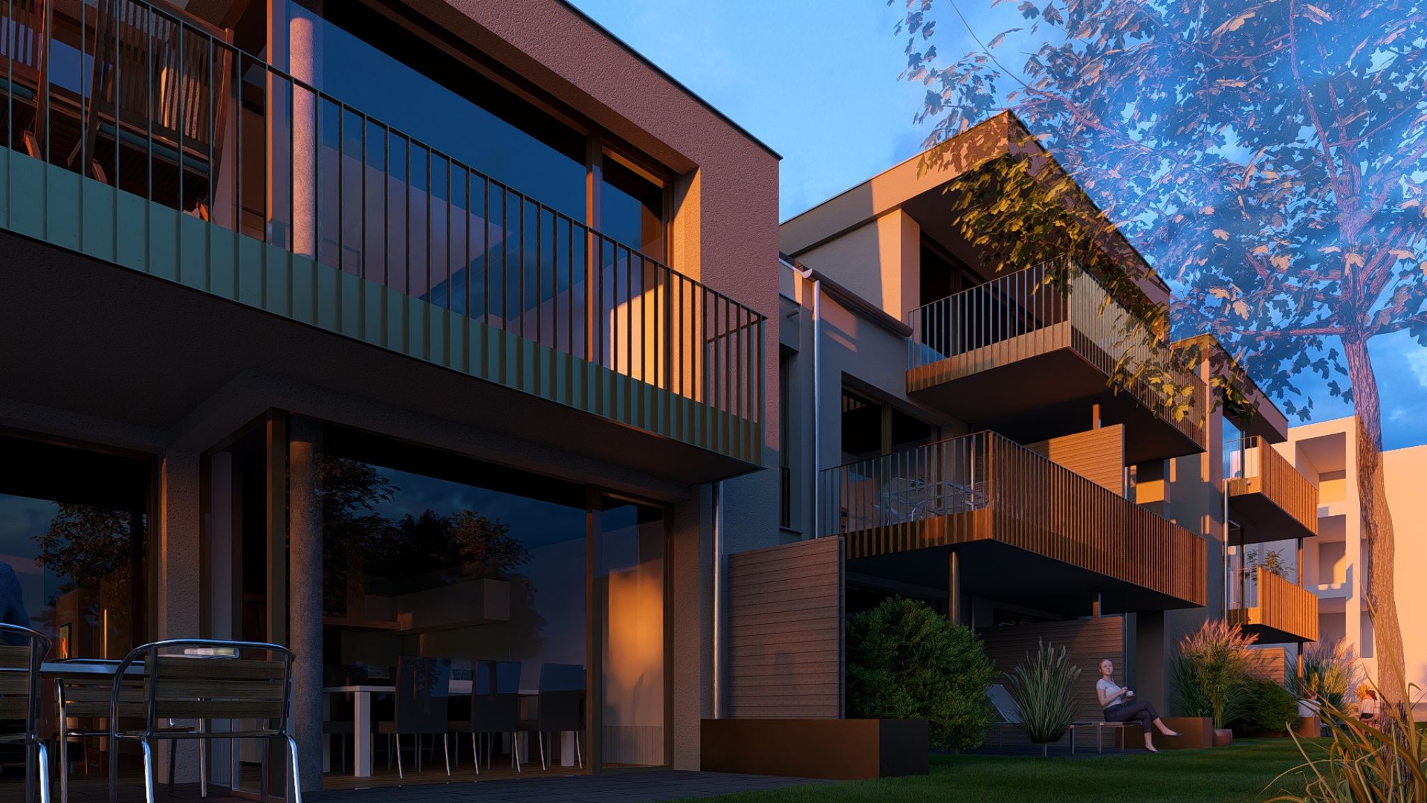 Zur Ausstattung gehören dreifach verglaste, raumhohe Holzfenster, elektrisch betriebene Außenjalousien, Eichenparkett in Wohn- und Schlafräumen sowie eine Fußbodenheizung mit Raumthermostaten. Anschlüsse für Waschmaschine und Trockner sind in jeder Wohnung vorgesehen. Die Vorbereitung für E-Mobilität ist integriert – Wallboxen können bei Bedarf ergänzt werden.